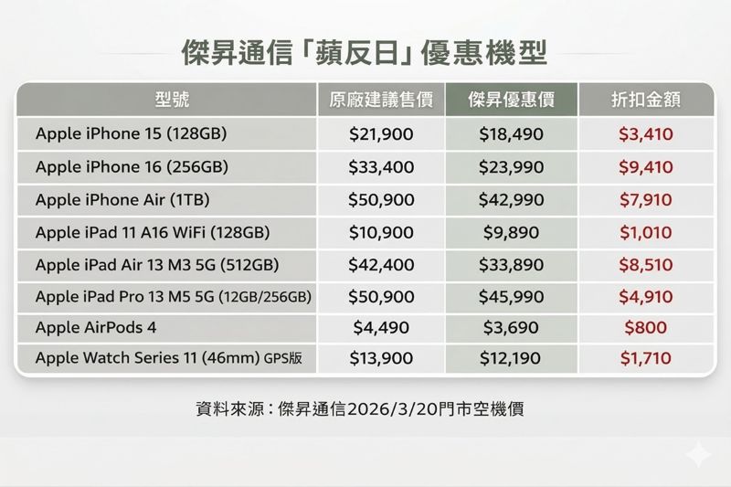 既然要「蘋反」,傑昇通信拿出最有誠意的iPhone新機開路。如果是喜歡拍照紀錄生活、隨時都要錄影片的重度使用者,輕薄極致大容量的iPhone Air(1TB)絕對是你的救星,原價50,900元,蘋反日期間直接砍掉7,910元,空機價只要42,990元就能帶回家;更狂的是,這三天只要到傑昇通信門市購買最新的iPhone 17系列(包含iPhone Air),直接加碼送500 元配件購物金,剛好可以帶個防摔殼或快充頭,讓你的愛機剛領回家就穿上最強護甲。